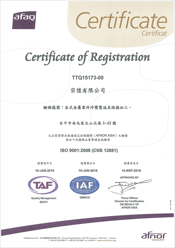 宗愷有限公司成立於民國84年,專業於金屬沖壓成品加工製造,具有完善的設備與技術。